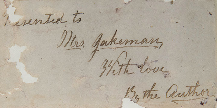 Snow, Eliza R. Poems, Religious, Historical, and Political Vol. I. Liverpool, London. 1856. Size: 5”x 7.25” (12mo). 271 pages. Publishers blue cloth over beveled boards and stamped half gilt decoration and lettering. Spine lettered in gilt. All edges gilt. Brown colored paste downs. A note inscribed by the author is on the first end sheet “Presented to/ Mrs. Gackerman/ with Love/ by the Author”.