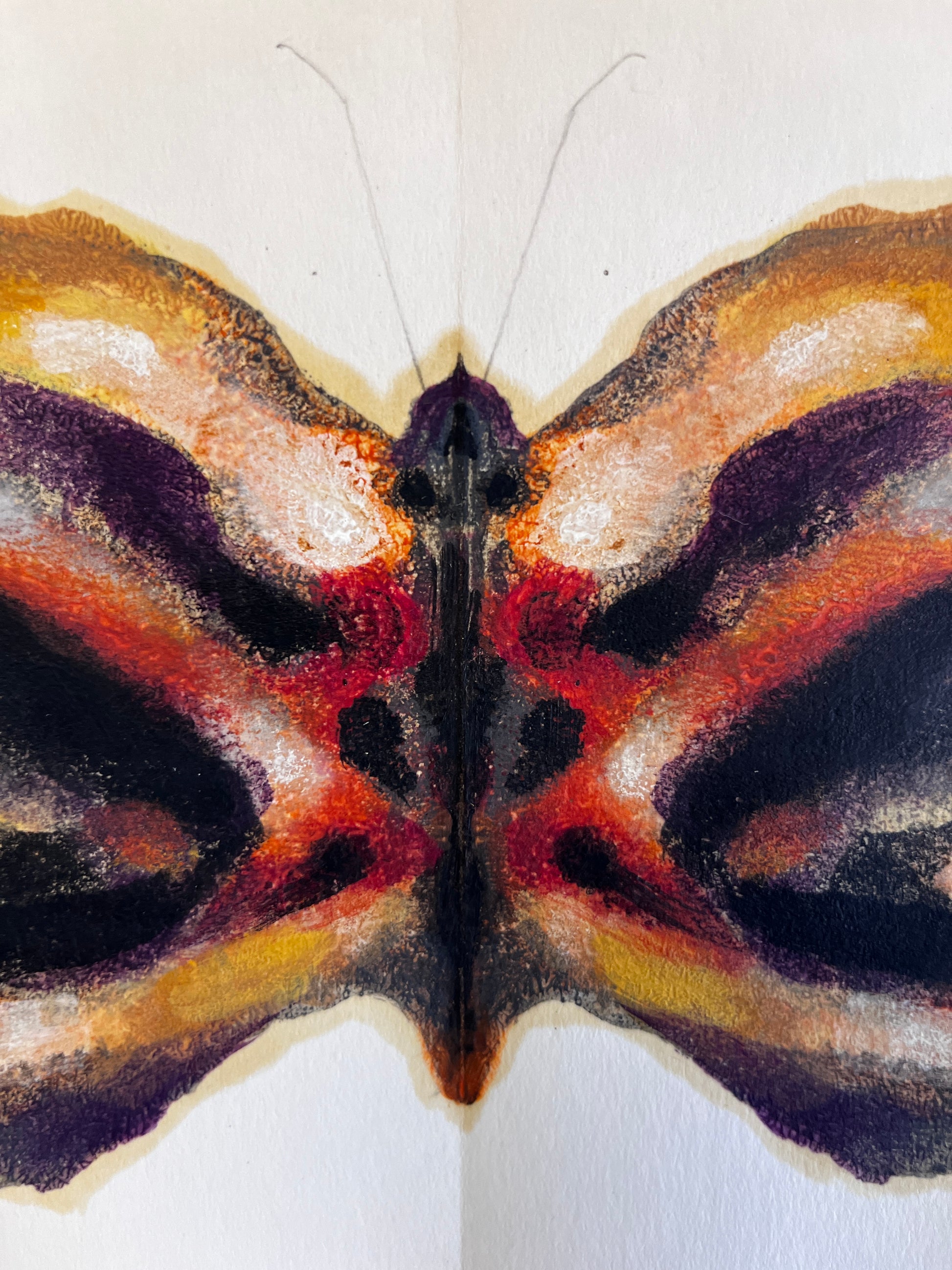 A vibrant butterfly rests against a blank backdrop. Its delicate wings, adorned with a soft yet striking combination of autumnal hues—golds, fiery oranges, and deep reds—create a warm and inviting presence. The patterns in stark black accentuate the colors and the butterfly’s graceful form, emphasizing the visual impact of color over intricate detail.