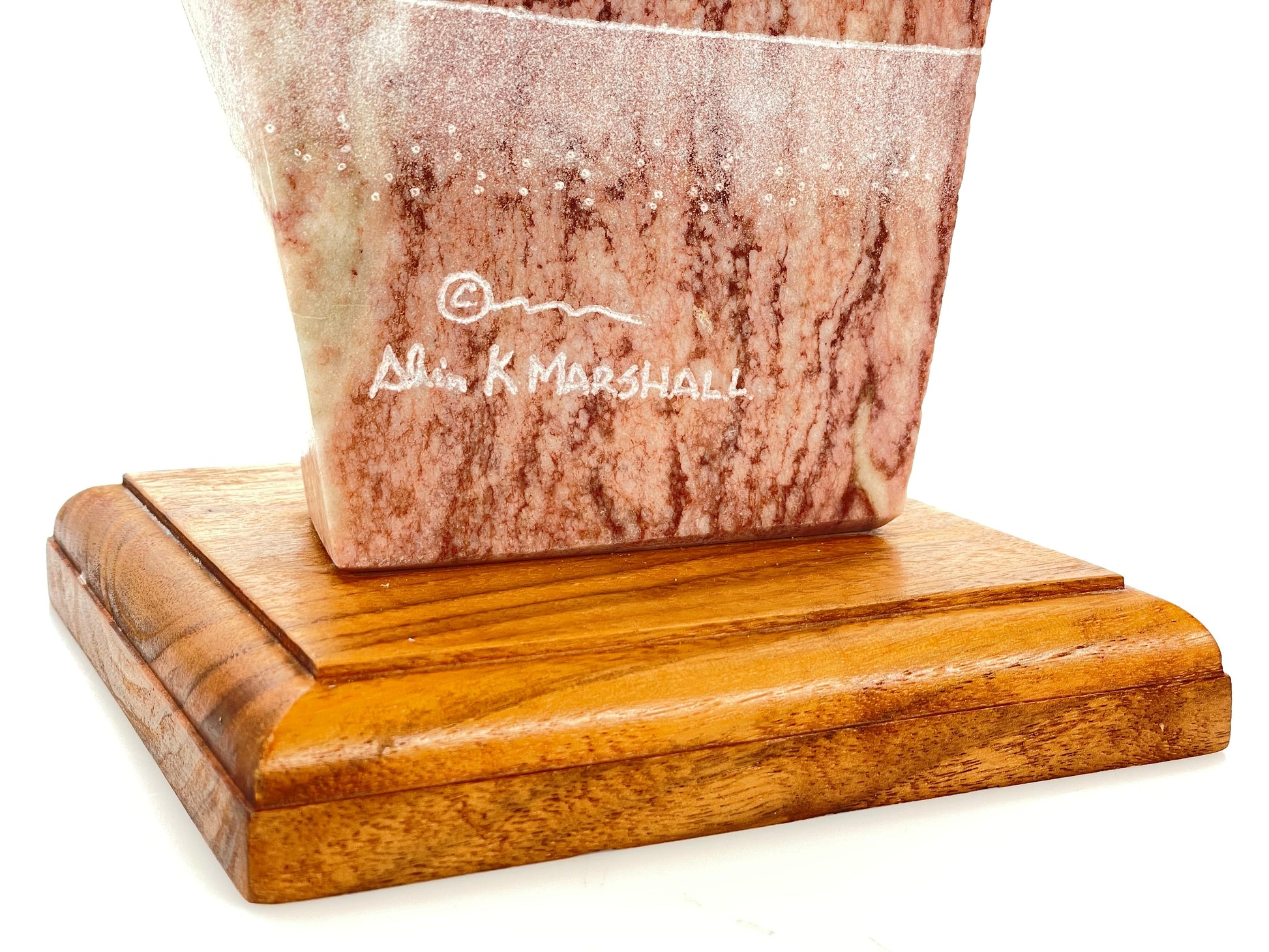 An Indian Maiden emerges from the alabaster stone, her hair delicately etched into the stone’s surface and radiating around her. The woman’s jewelry is large and dominant, lending the pieces a dignified and ethereal quality. The woman’s calm and contemplative expression invites the viewer into similar introspection.