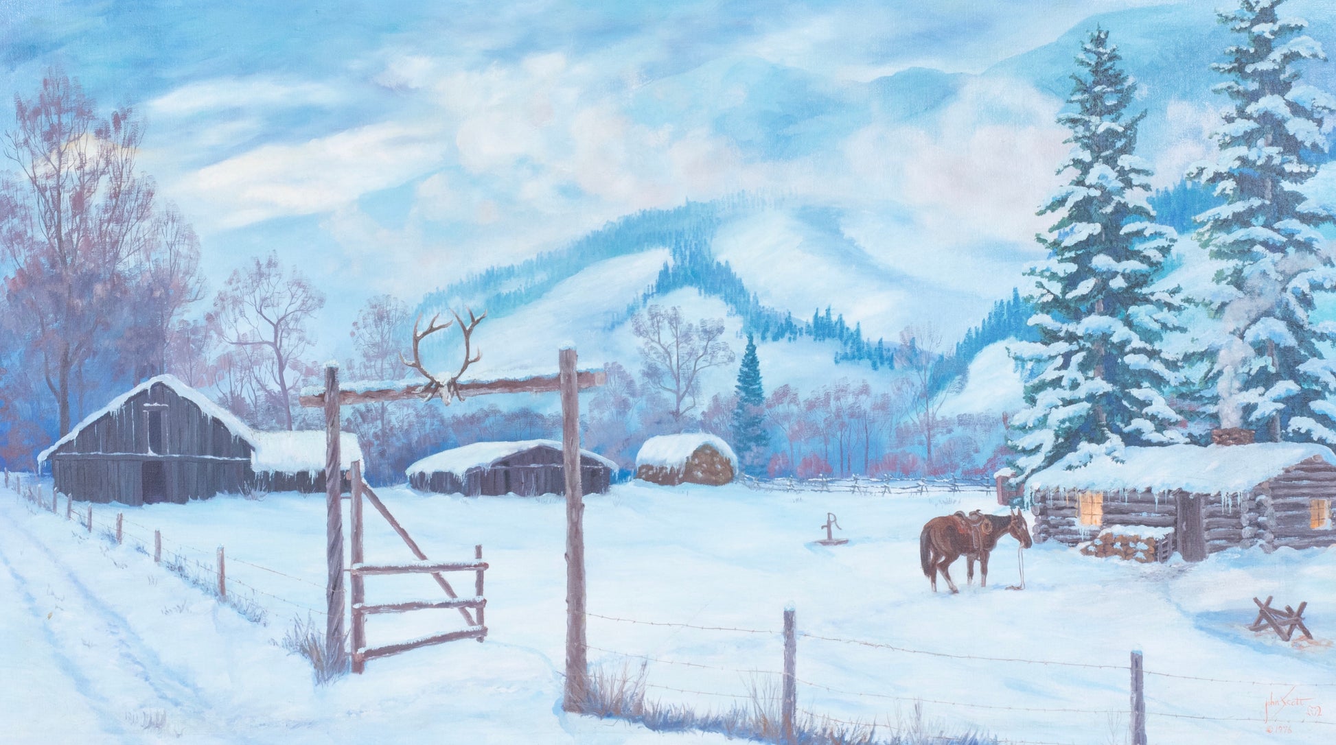 A tranquil wintery landscape, this picturesque view of a Colorado ranch of a rather large scale features an entrance gate adorned with an antlered elk skull, a lone horse in the coral before a log cabin with firelight shining through its windows, several charming barn buildings, clusters of deciduous and tall snow-encrusted evergreens bordering the ranch, the hills beyond lined with more evergreens, and billowing clouds in the sky above that almost camouflage the grand mountains not to be dismissed in the distance. A peaceful winter retreat replete with quiet beauty and blanketed in pristine snow by Coloradan artist John Scott.
