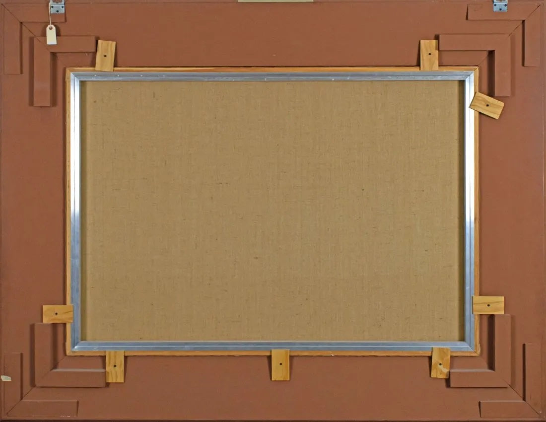 The dark shape of a bull moose—its detailing comprising subtle, indefinite contours—imposes itself against a simple, two-dimensional backdrop of bright but earthy color and clearly cut lines. The smooth figure of the moose contrasts with the cracking paint around it.