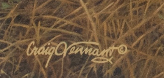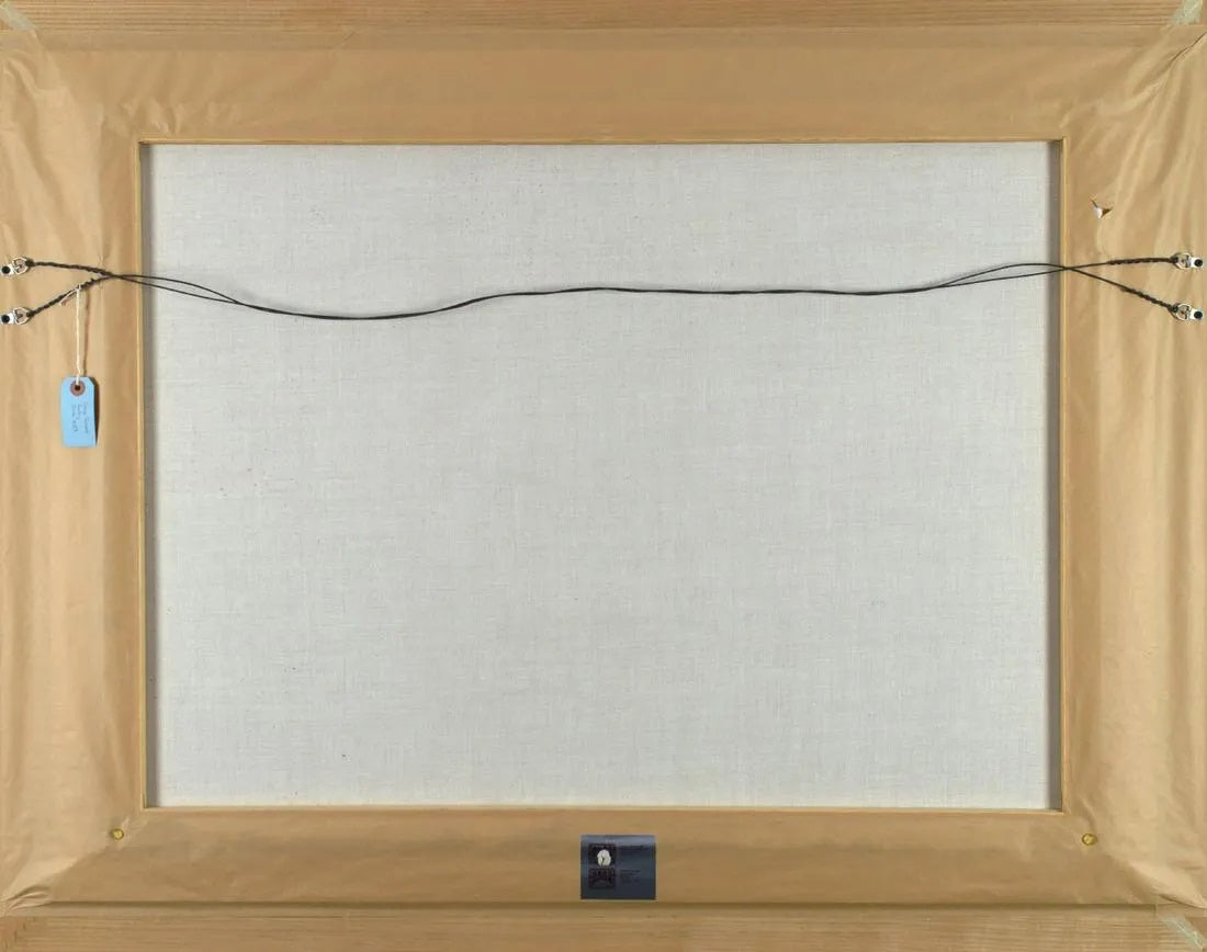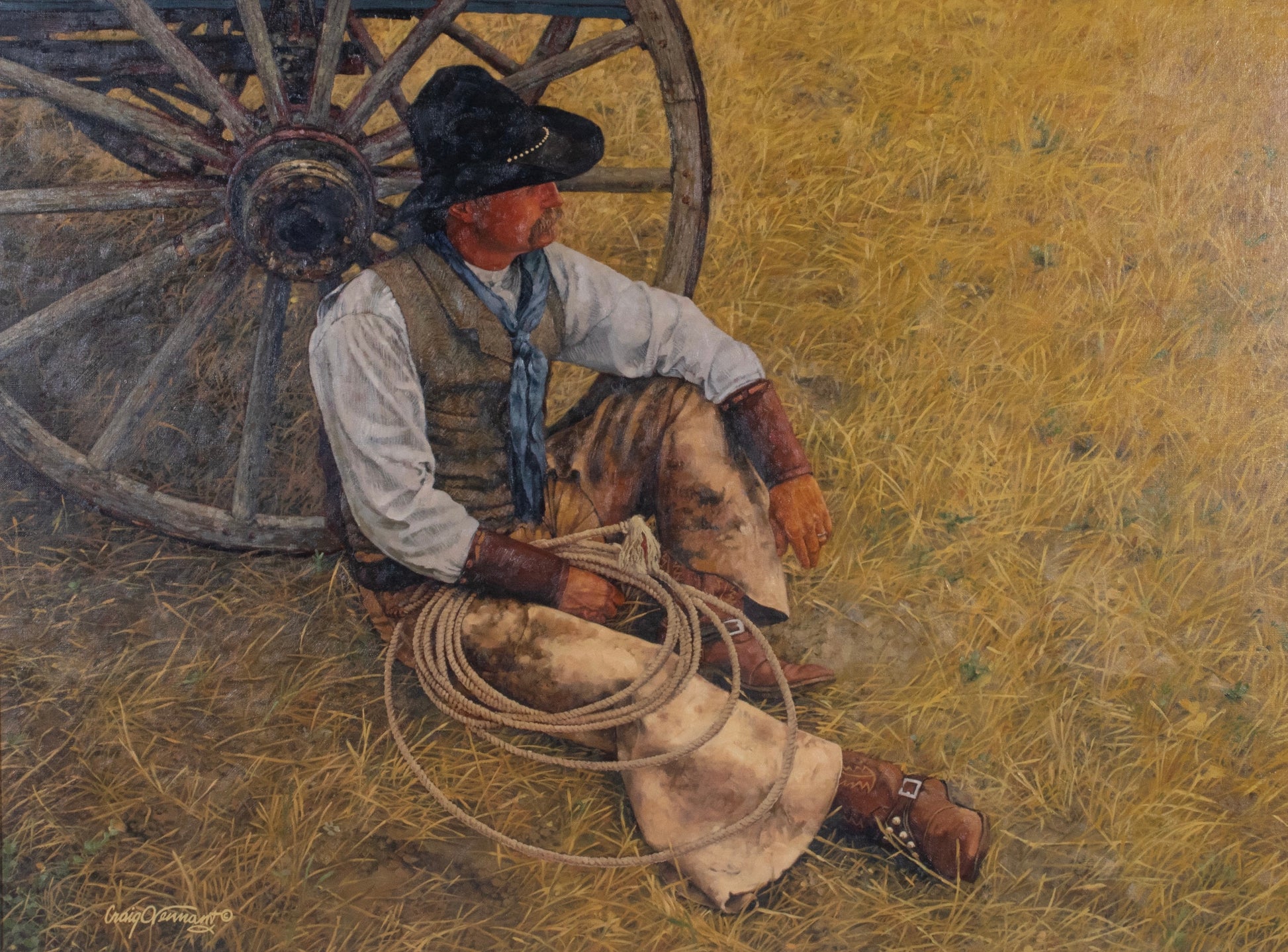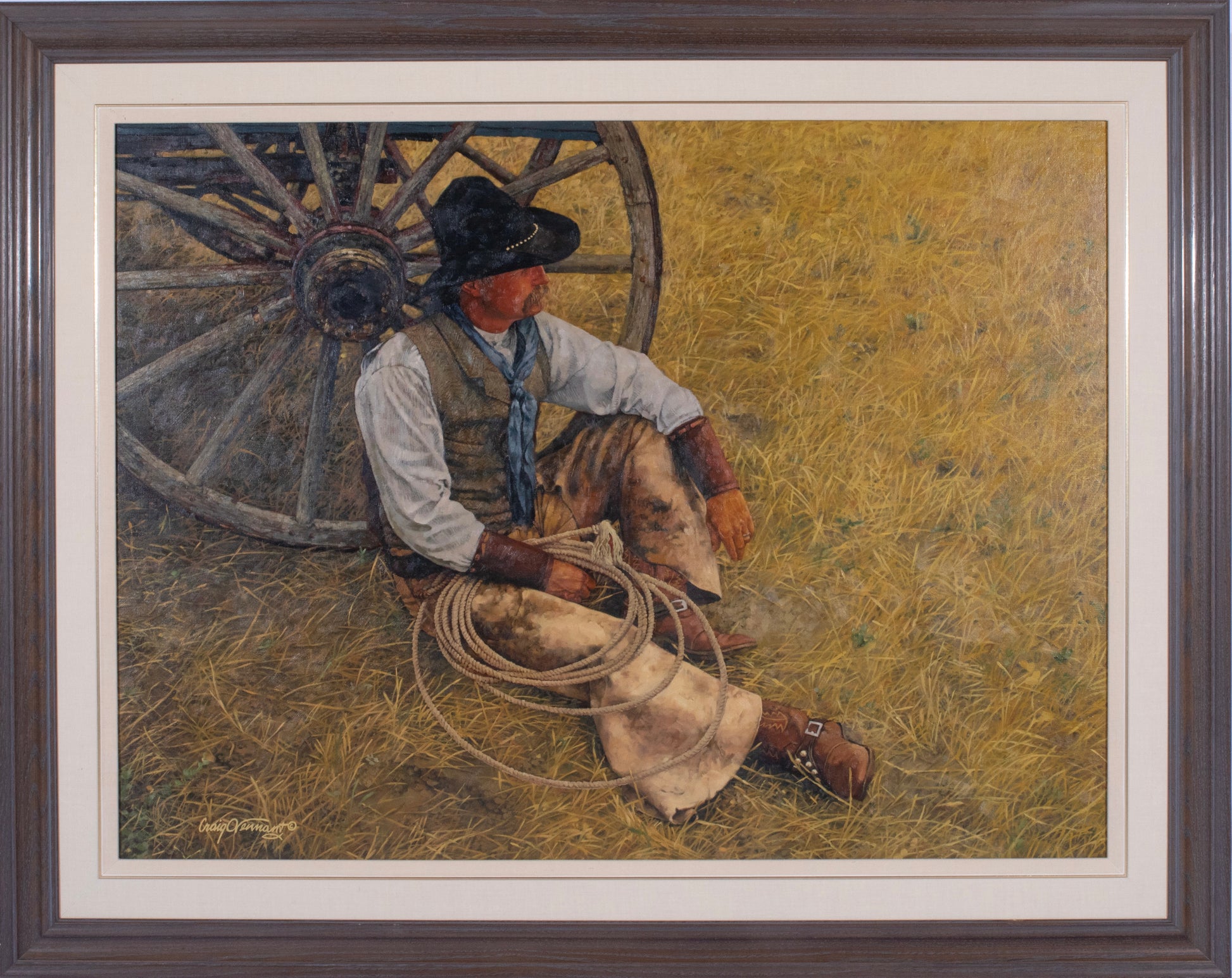A cowboy slumps against the wheel of a wagon, boots on and rope in hand. The man is painted in great detail—his hat studded, vest a herringbone knit, cuffs and boots sturdy leather, and his work chaps a tough suede. Bright yellow grass provides a vibrant backdrop for this western lifestyle piece.