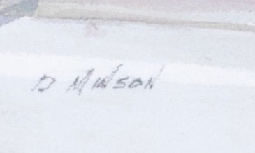In this delicate watercolor, Minson captures Utah Valley’s historic Lehi Roller Mills. A dark greenish-gray sky hovers above, casting shadows across the scene. A large red truck parks by the building while laborers appear to partner up to load and haul inventory. The artist includes soft details to capture a narrative.