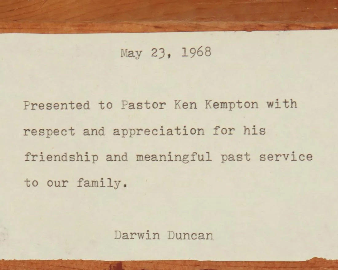 “Presented to Pastor Ken Kempton with respect and appreciation for his friendship and meaningful past service to our family.”