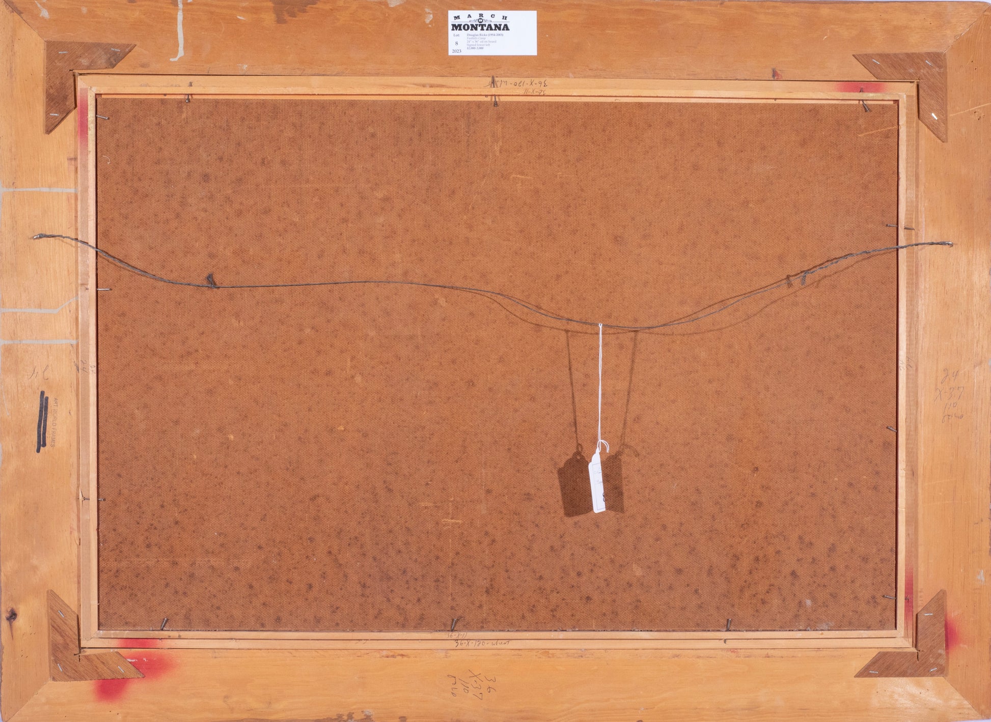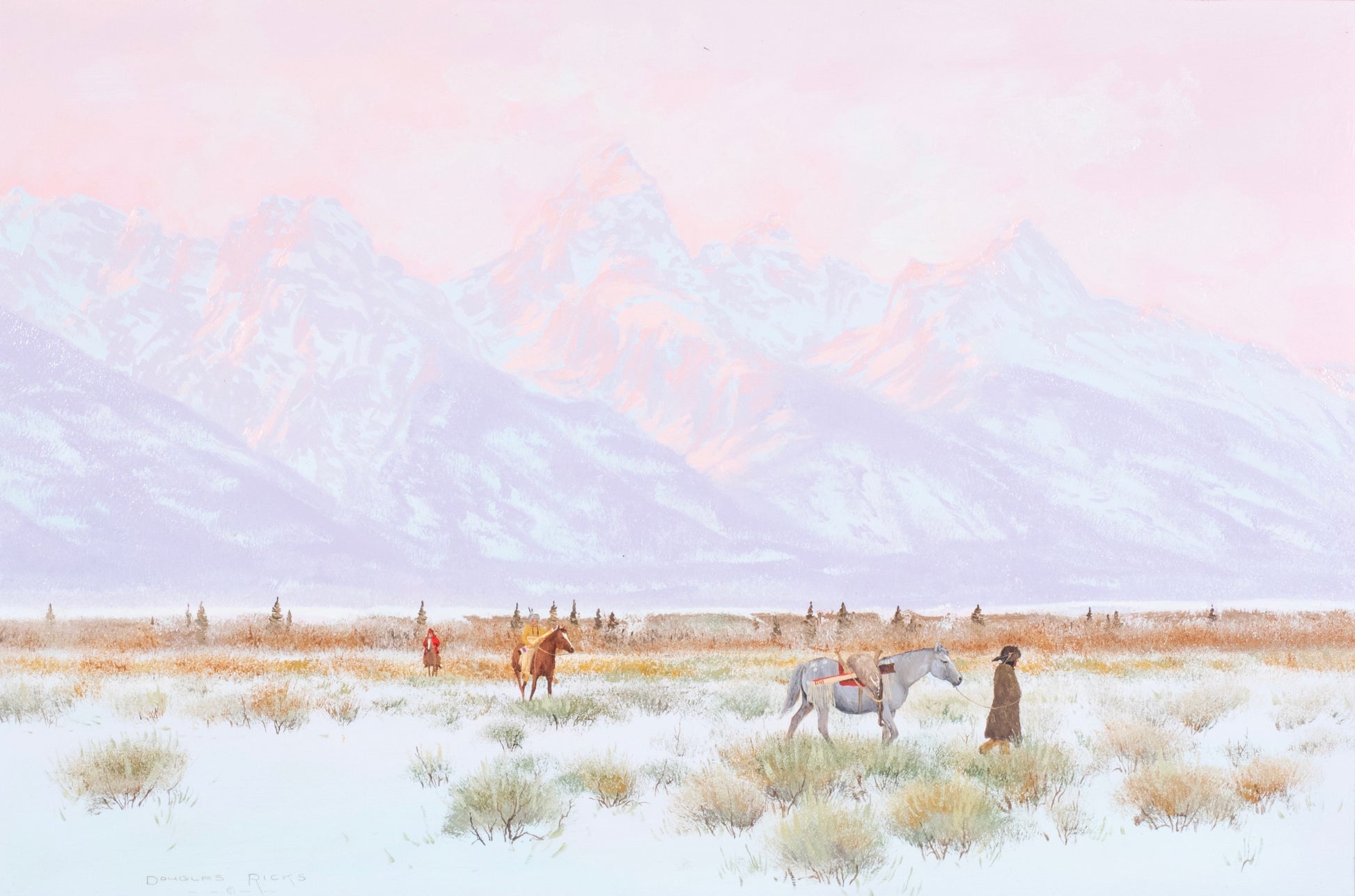A figure guides his horse across the plain, another two horses and their riders following closely behind. Small shrubs sprinkle the scene, a few trees dotted throughout. Detailed mountains fade almost entirely into the background, grounding the scene while emphasizing the foreground’s subjects. The complete scene is beautifully washed out and bright, producing light across the canvas.