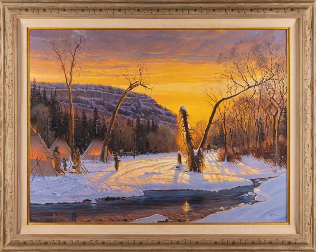 Set by a stream, a group of Native Americans eagerly anticipate the arrival of a mounted figure with a pack horse in tow. Against the vivid golden hues of the sunset, shadows cast intricate patterns across the snow, creating a mesmerizing play of light and darkness, which is further enhanced by the teepees aglow from warm, crackling fires within.
