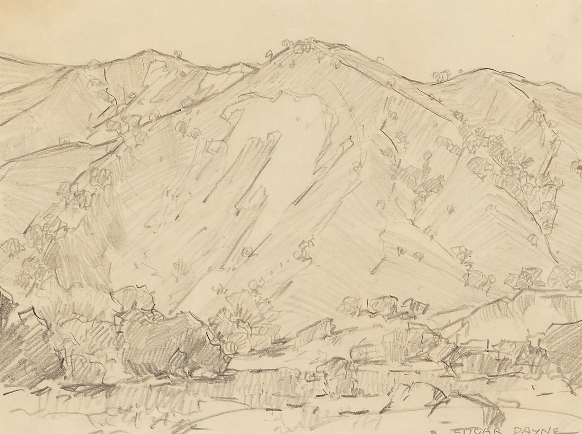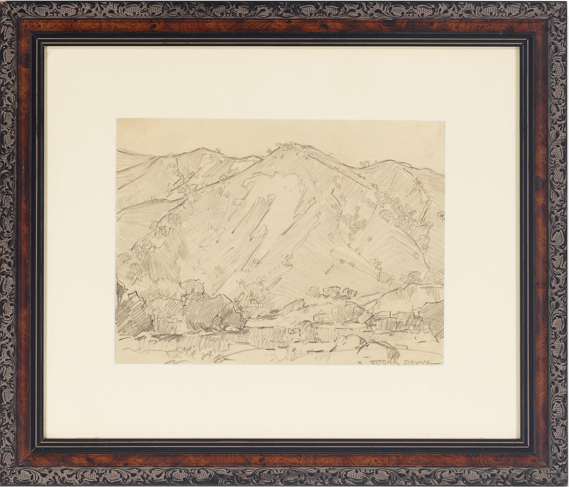 This landscape captures California hills in simple lines and minimal detail. Payne uses contour shading – straight, multi-directional lines used to depict depth – to capture details of the mountains and the surrounding landscape. Loose, undefined shapes represent rocks and trees. Payne was a respected plein-air landscape painter. This is likely a sketch he made and used to later paint the same scene in his studio.
