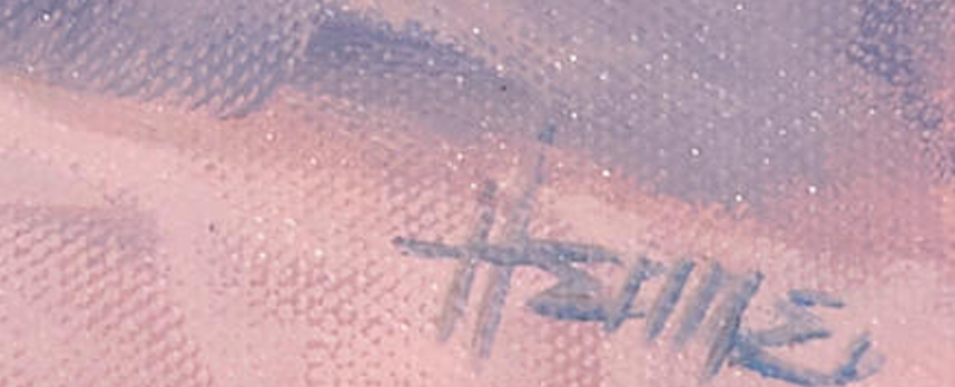 A standard log cabin surrounded by feet of snow sits in a forest clearing. In the distance, tall mountain peaks touch the clouds. A warm pink tint and chimney smoke radiate warmth over this snowy scene. A team of huskies stand off-guard harnessed to an empty sled. Vertical paint strokes of vibrant blue, red, and yellow hues throughout the trees give a beautiful liveliness to Goodale’s Alaskan landscape.