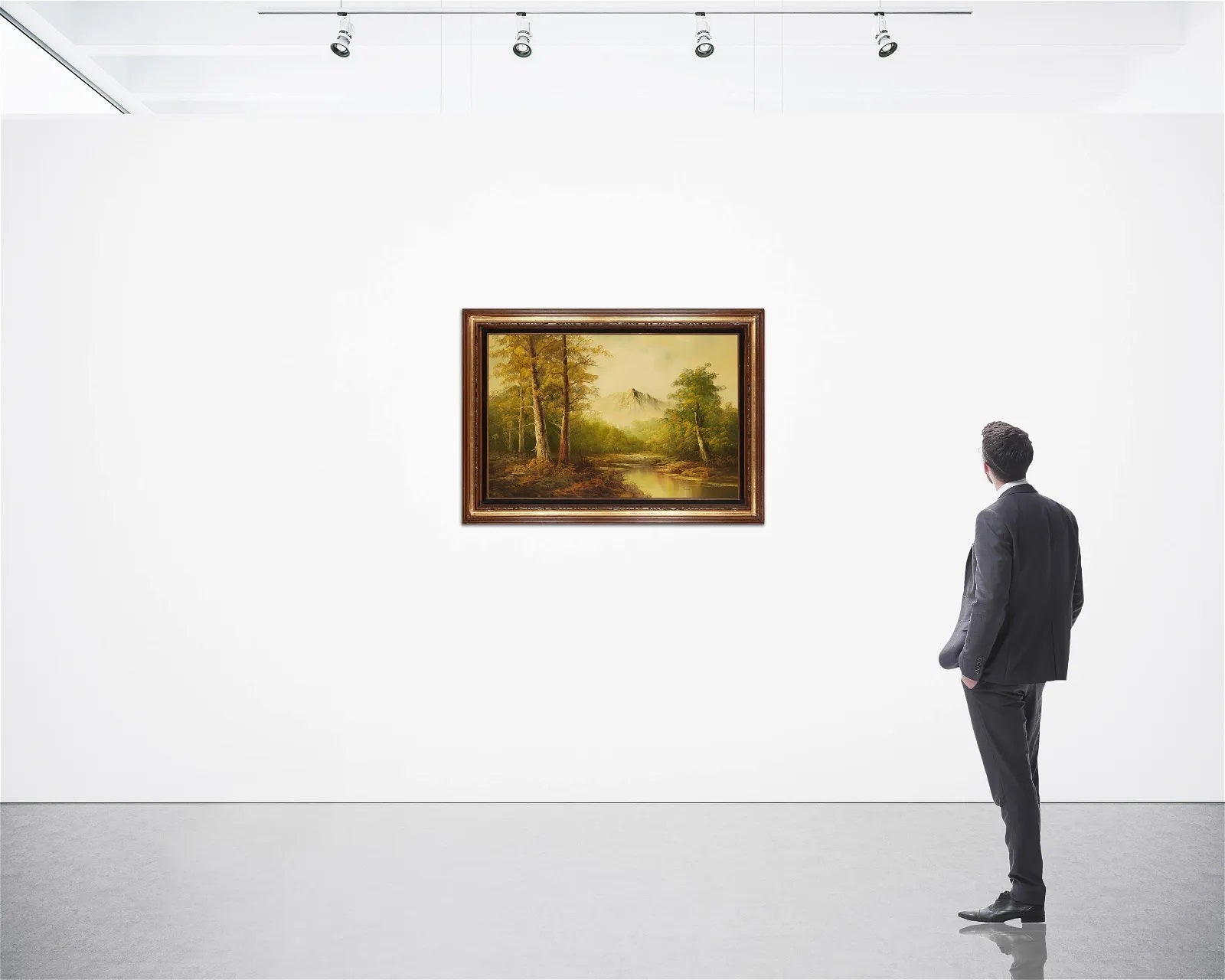 A mountain is framed by a serene, dark, but warmly lit autumnal riverbank, and fades indistinctly into an overcast sky. The tone and lighting of the painting has heavy Luminist strains.
