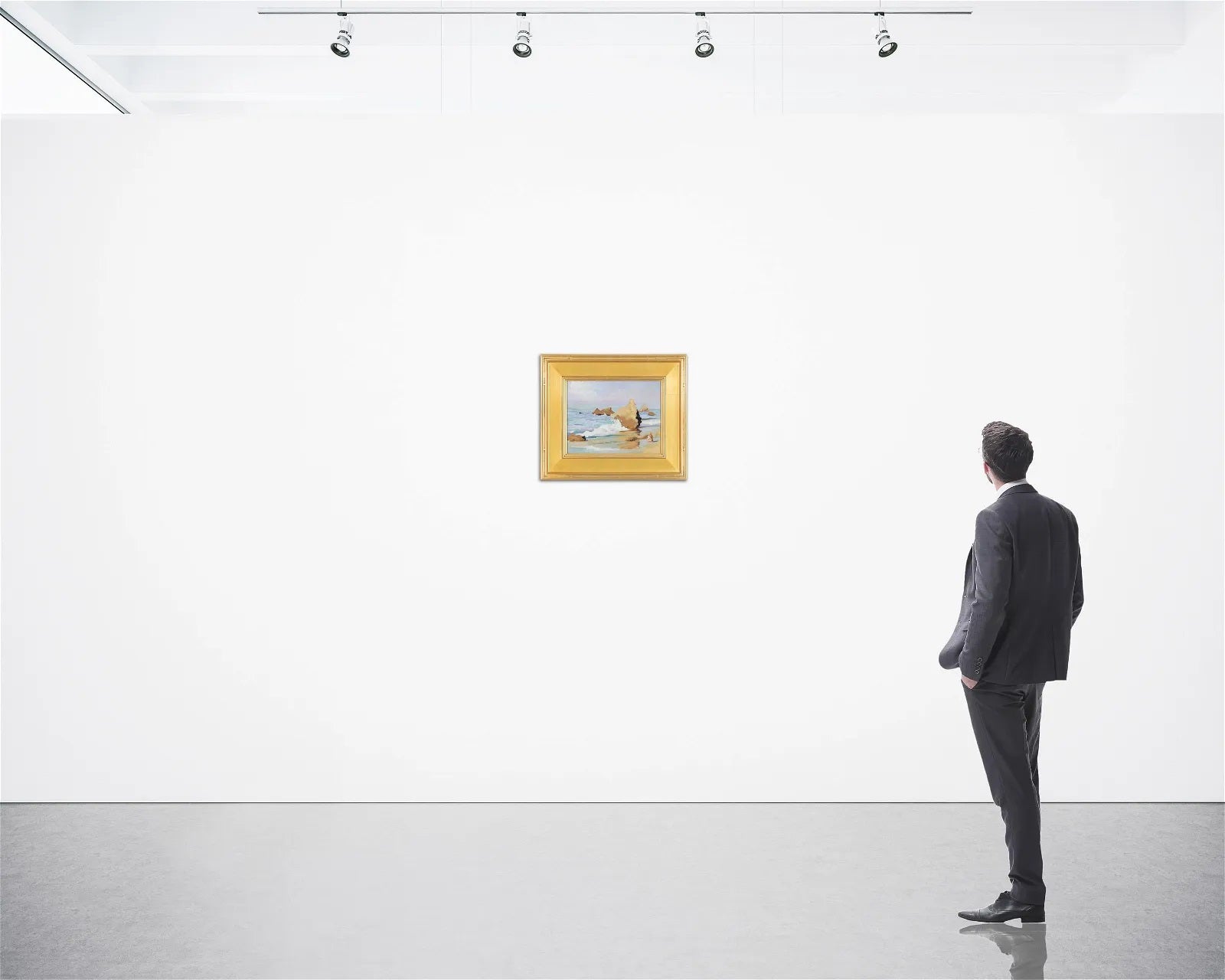 A woman holds her infant on the shoreline. She leans forward, waiting for the waves to break and the soft seafoam to reach them. The horizon melts purple sky and blue-green ocean together, with cool tones surrounding rocky shores. The painter uses loose brushstrokes to create a soft scene that is both inviting and warm.
