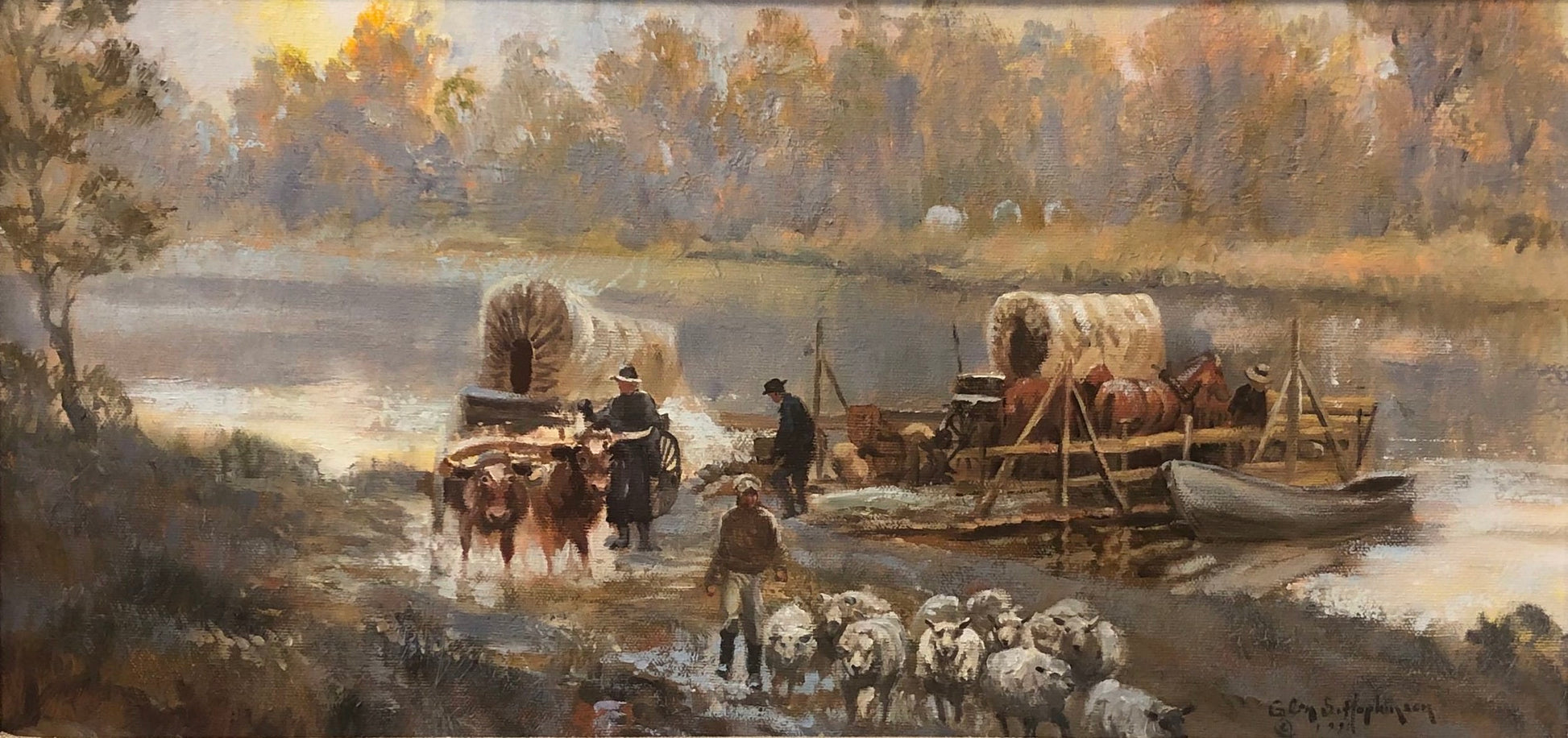 A group of frontiersman traverse a river, guided by a sturdy raft carrying covered wagons, horses, oxen, and a flock of sheep. The interplay of light on the water and the treetops infuses the scene with a warm and inviting ambiance in the face of travail. Amidst the crystalline serenity of the river, the dynamic splashes created by the oxen, men, and sheep evoke a sense of both determination and harmonious chaos. This captivating depiction evokes the spirit of exploration and the challenges faced by pioneers and their arduous journey.