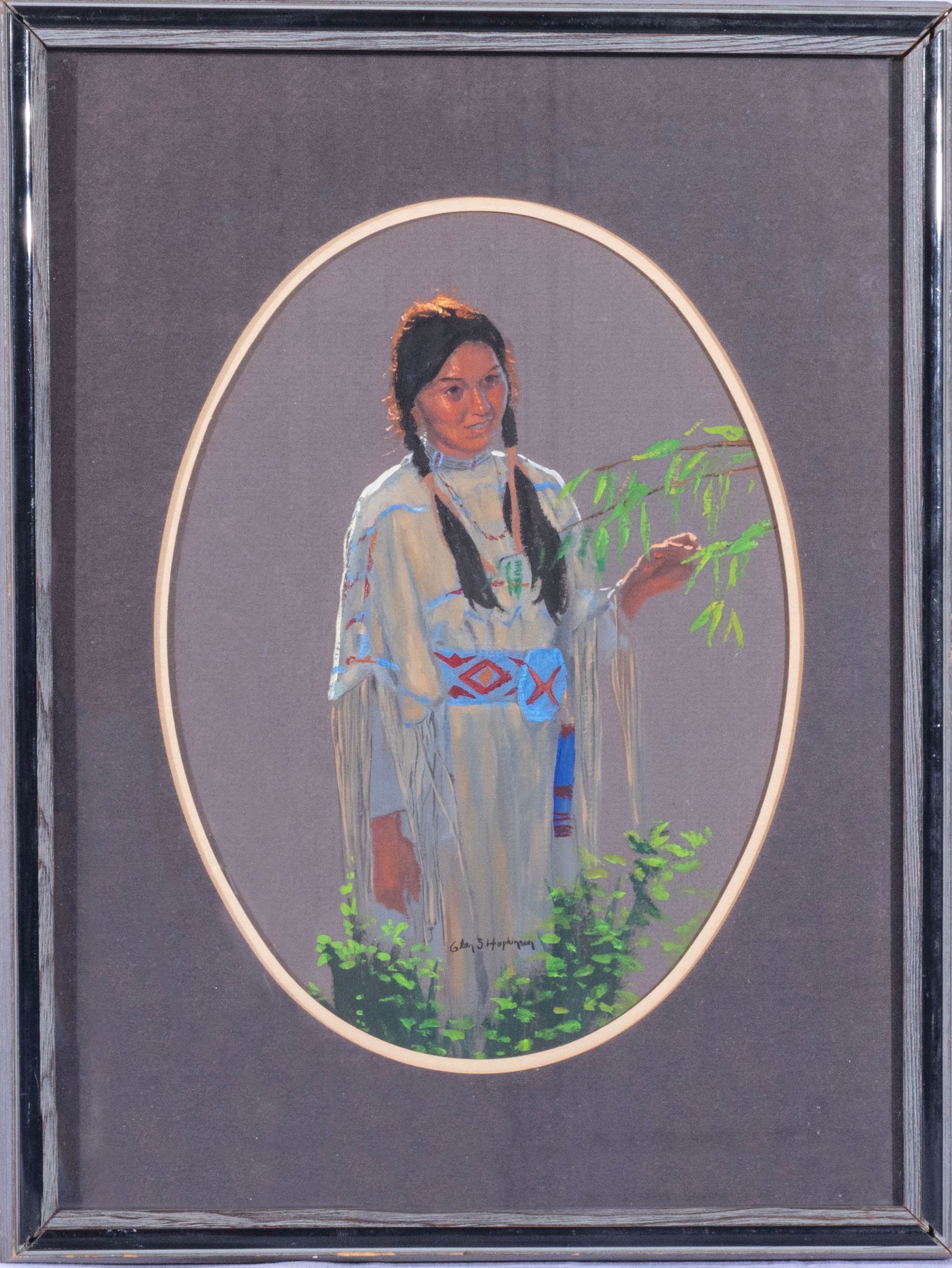 This beautiful portrait by Glen S. Hopkinson depicts a young Native American woman standing amidst soft foliage, her serene expression and gentle posture capturing a moment of quiet connection with nature. Dressed in a traditional fringed garment adorned with intricate beadwork and geometric patterns, she reflects the rich cultural heritage of her people. Her dark braids and delicate jewelry enhance the authenticity and grace of the composition.