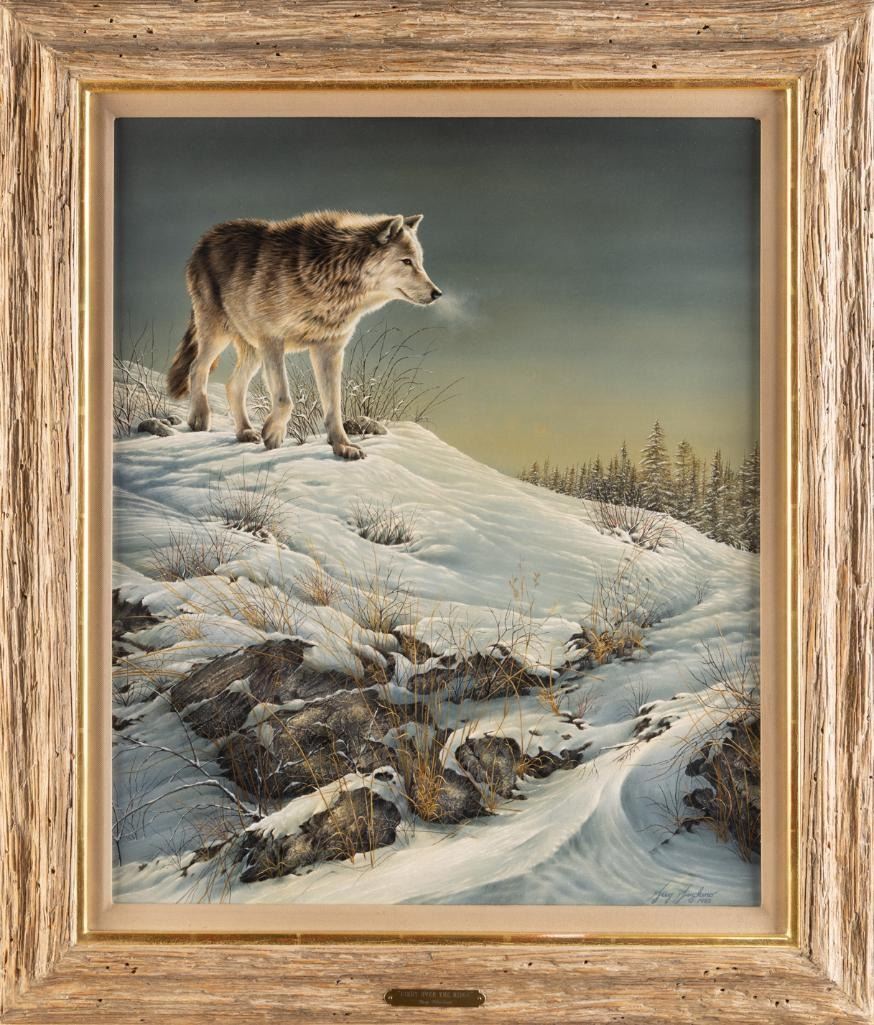 With impeccable photographic realism, a wolf is depicted standing atop a snow bank, its breath visible in the frigid air, and his eyes watchful. The painting is carefully composed, featuring a contrast of colors, as in a sky that transitions from a warm, muted gold to a deep and foreboding gray. The snow is painted with dynamic brushstrokes, giving the impression of motion. Golden blades of grass break through the snow, adding a sense of hope and life to this otherwise bleak winter landscape. The rocks and snow-dusted pines create a sense of texture and depth to the composition.