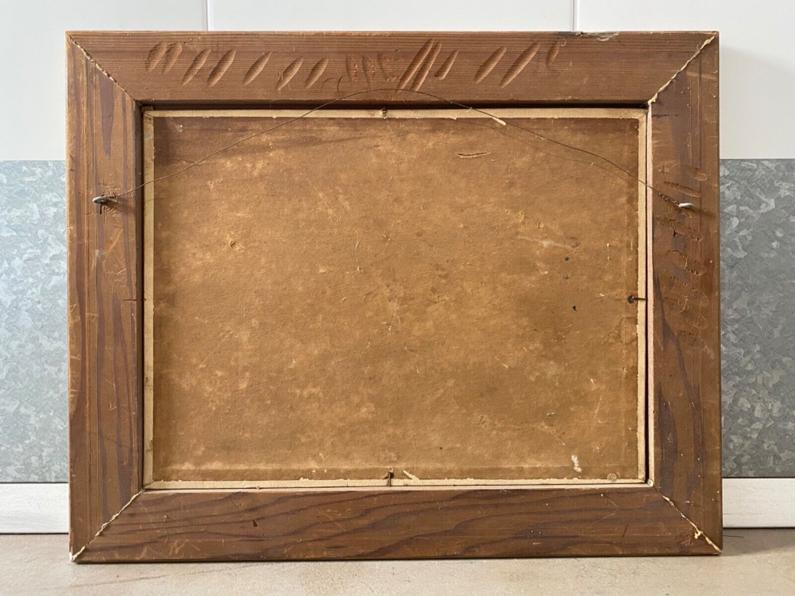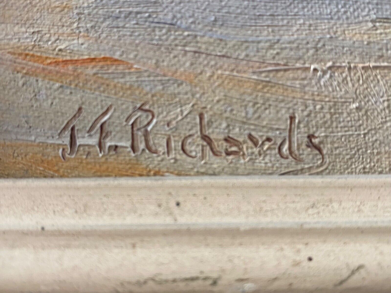 The jagged bank of a dried river curves into the desert landscape. A range of mountains are painted in a clean ombre, from blue to gray. Despite the scene’s lack of water, plants along the bank are green and thriving. The scene maintains a generally pale color palette, complete with shadows for depth.