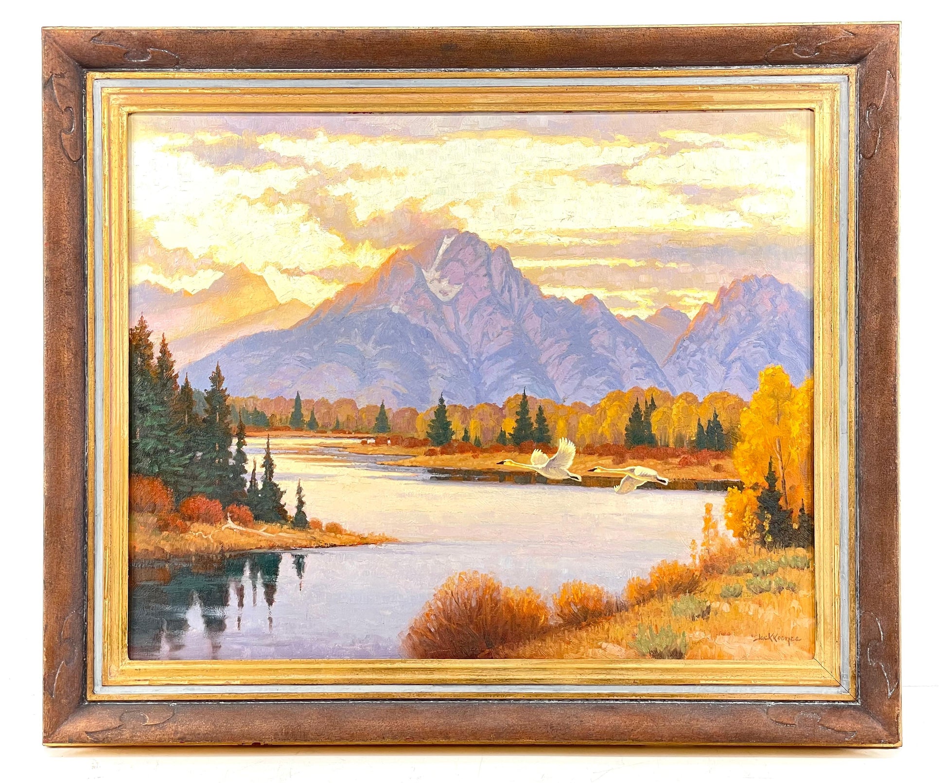 In this serene evening landscape, two geese glide above a calm river. A setting sun envelops the rising mountains in a haze of blues and purples, while illuminating the clouds with splendid intensity. Cool colors set starkly against the landscape’s warm autumn hues create a sense of longing and nostalgia.