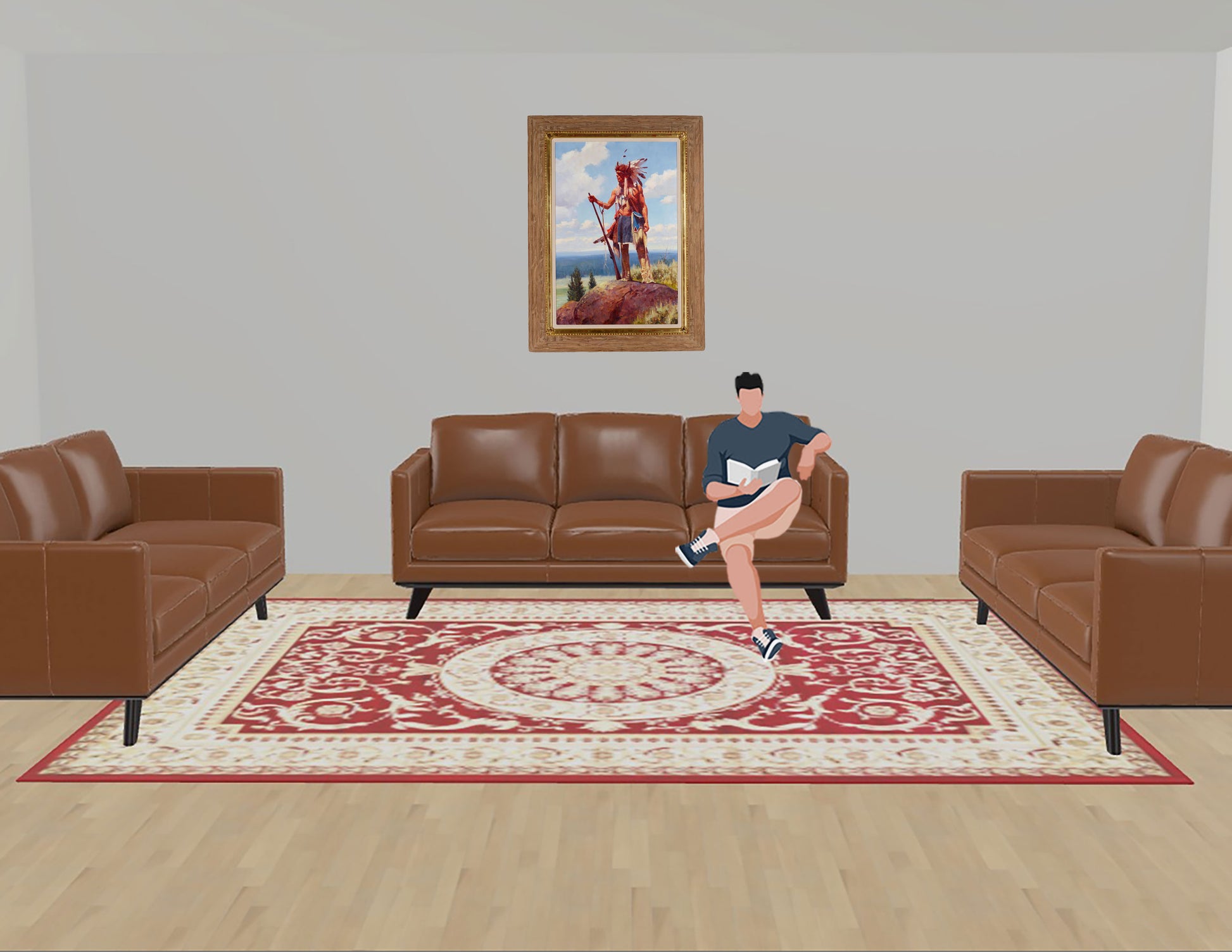 The sharply defined, warmly colored musculature of an Indigenous American man stands sturdily against a soft blue sky. The casual power of his stance, gaze, and splendor is paralleled and complemented by the grandeur of the valley below. This artwork celebrates the beauty of the land and the figure’s intimate connection with it.