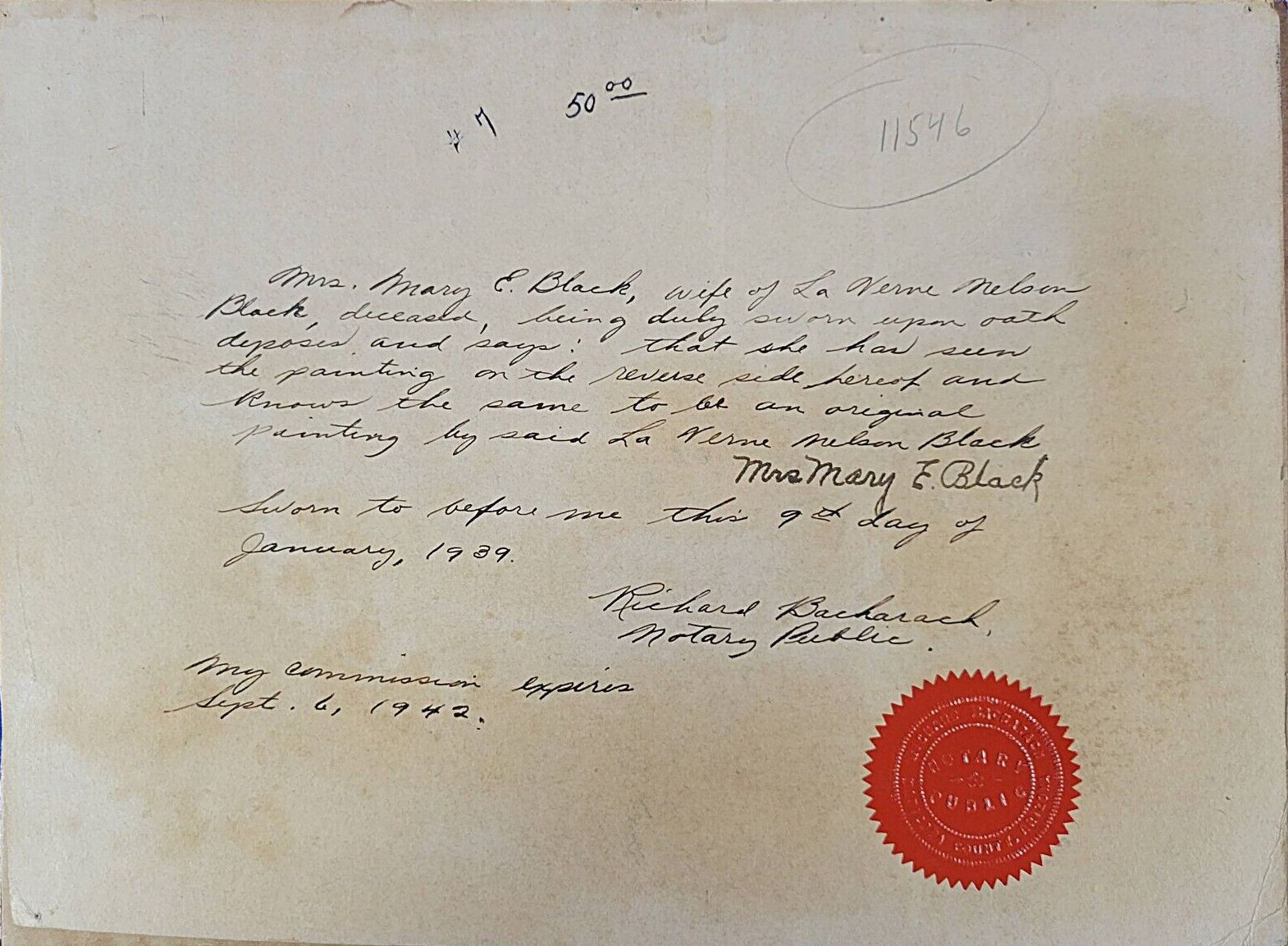 A notarized affidavit from January 1939 appears on the verso of the painting, with a testament that it was painted by Laverne Nelson Black, signed by the Artist's wife, Mary E Black.
