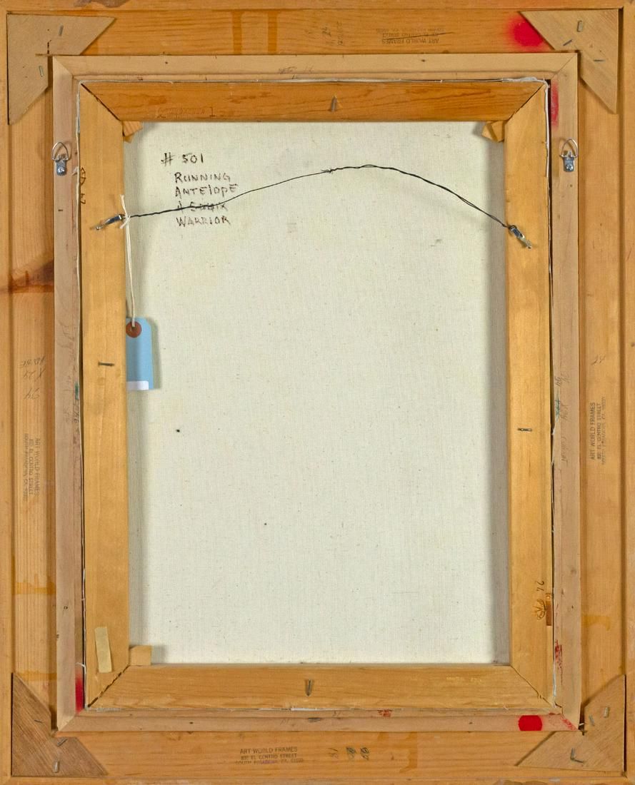 A Sioux Warrior is painted in warm colors and incredible detail. Dramatic lighting ages the figure, accentuating fine lines and contouring worn features. Red tints the hair, colors the clothing, and appears printed upon accessories. While the lower portion of the canvas appears unfinished, the open space allows for the meticulous details of the Sioux Warrior to grab the viewer’s attention.