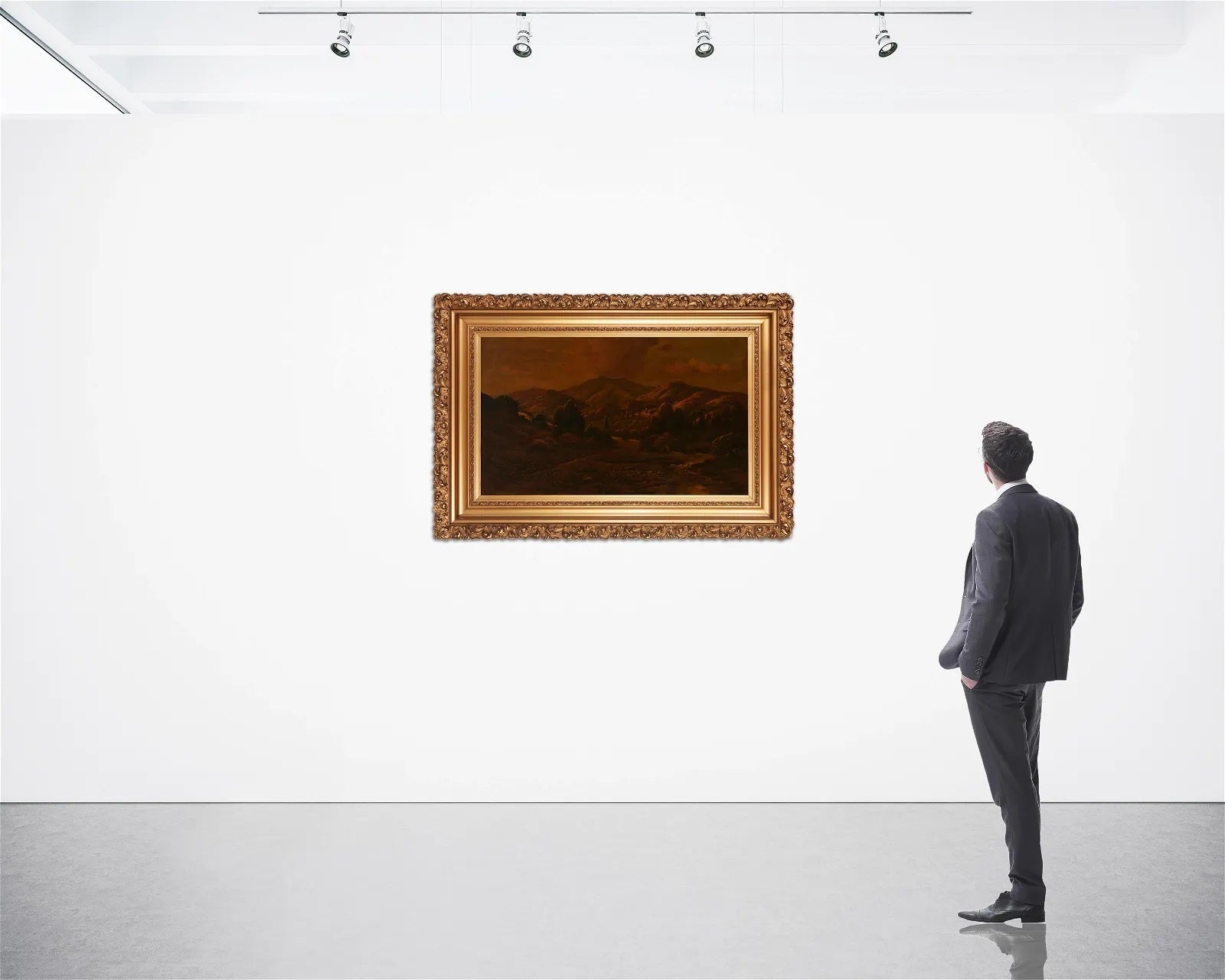 A landscape of rolling hills and sparse vegetation is thrown into a foreboding intensity by dark, muted reds—an exaggeration of the evening light suggested by the title. The billowing clouds above the distant mountains make for an almost volcanic effect.