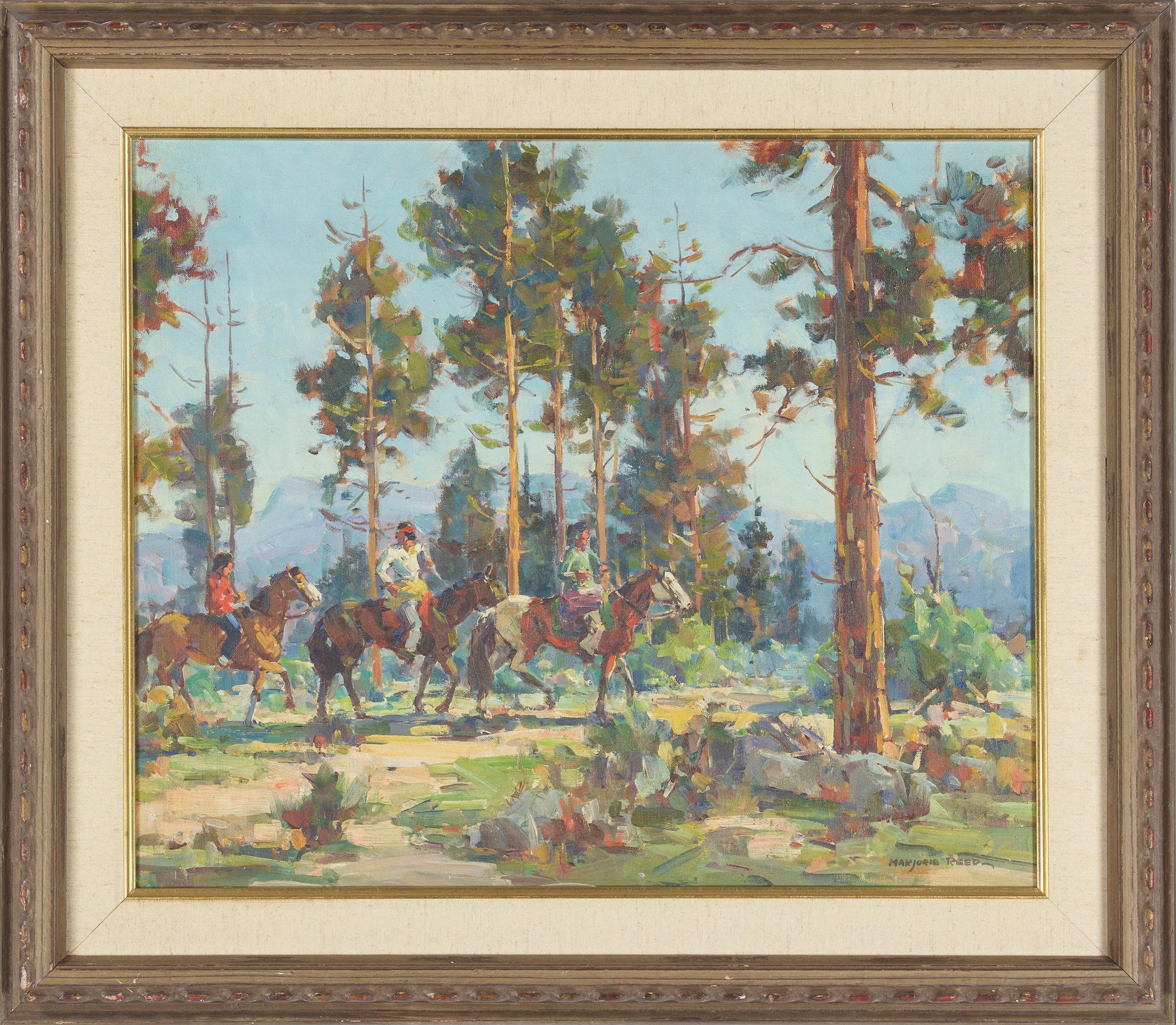 Three indigenous figures astride horses lead a spirited journey through the heart of a resplendent forest. Broad brushstrokes capture the dynamic movement of the riders and their equine companions. Autumn’s embrace is evident in the foliage, where glimpses of amber, crimson, and ochre are caught flickering in the sun. Painted in soft, ethereal tones, grandeur mountains stretch hazily across the backdrop. The figures on horseback exude a sense of harmony with their surroundings, their presence both bold and harmonious amidst nature’s vivid display.