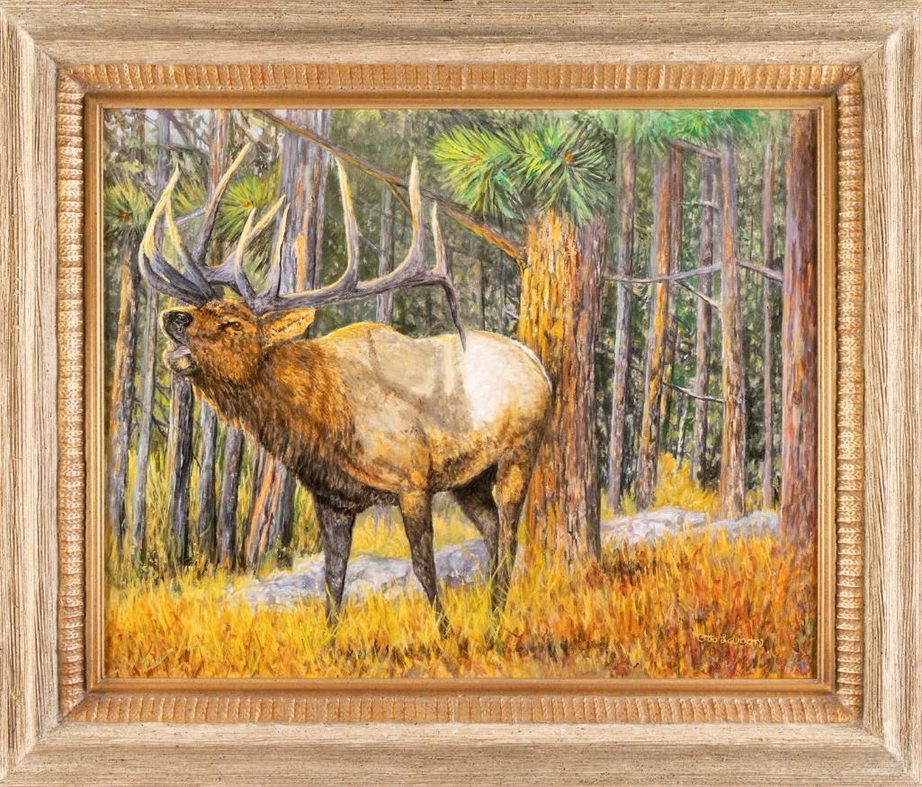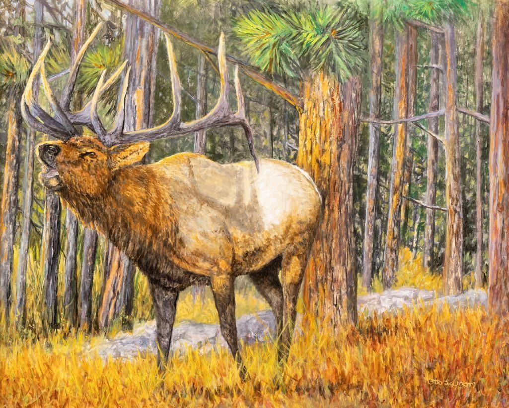 A powerful bull elk bugles in the golden morning light, as if challenging the coming day. Behind him, tall pine trees provide a natural backdrop, while the bright and vivid lighting captures the essence of the moment. The artist’s skillful blend of realism and impressionism creates a sense of dynamism and energy.