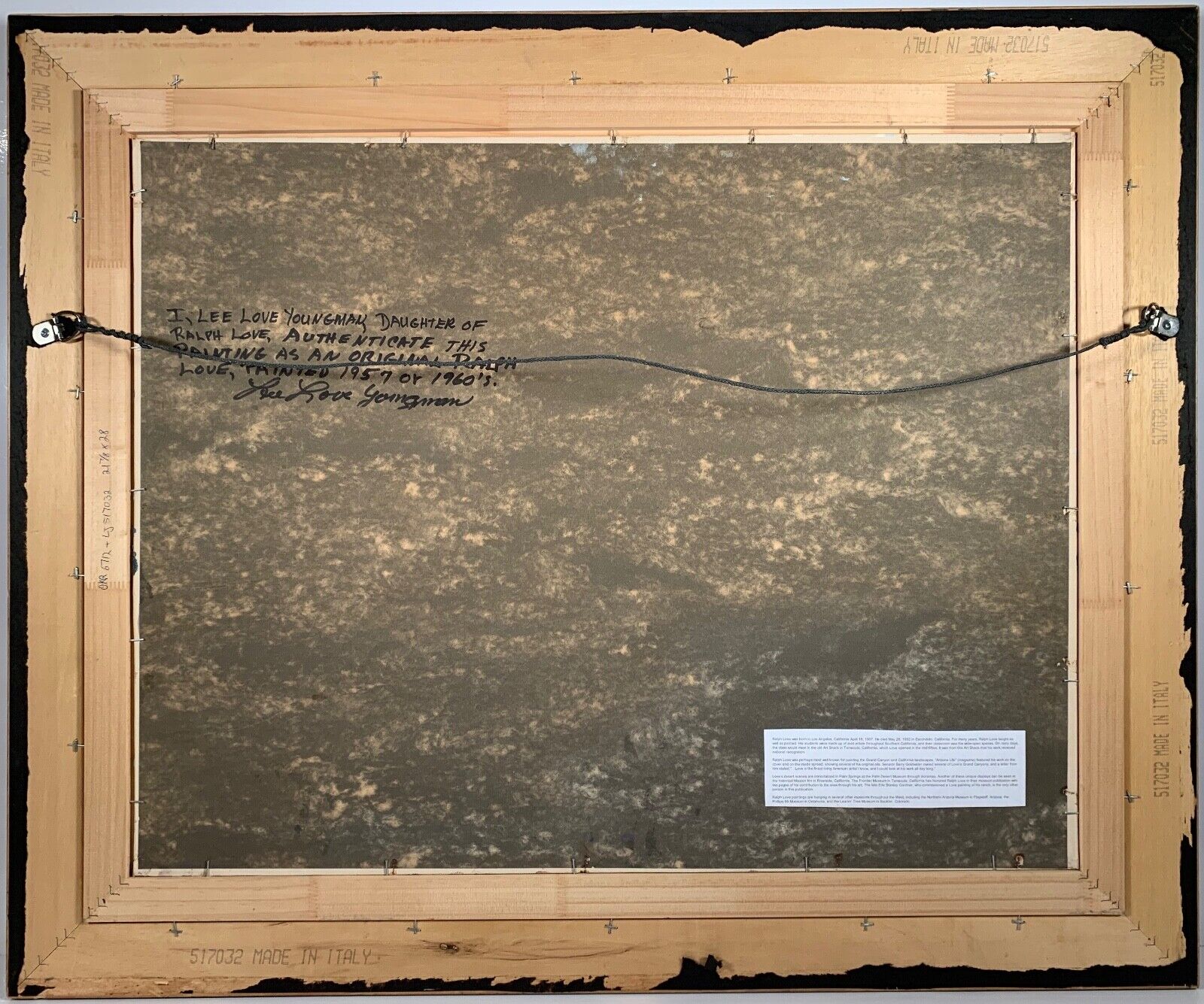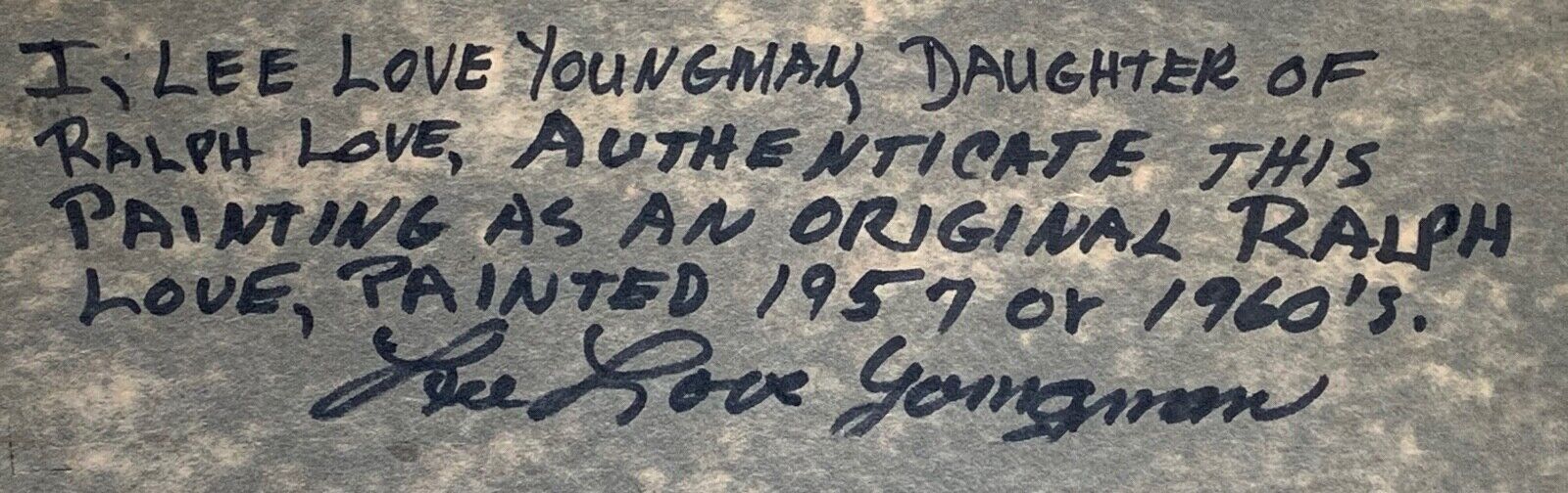 Verso: Inscribed: “I, Lee Love Youngman, daughter of Ralph Love, authenticate this painting as an original Ralph Love, Painted 1957 or 1960’s.” / Lee Love Youngman