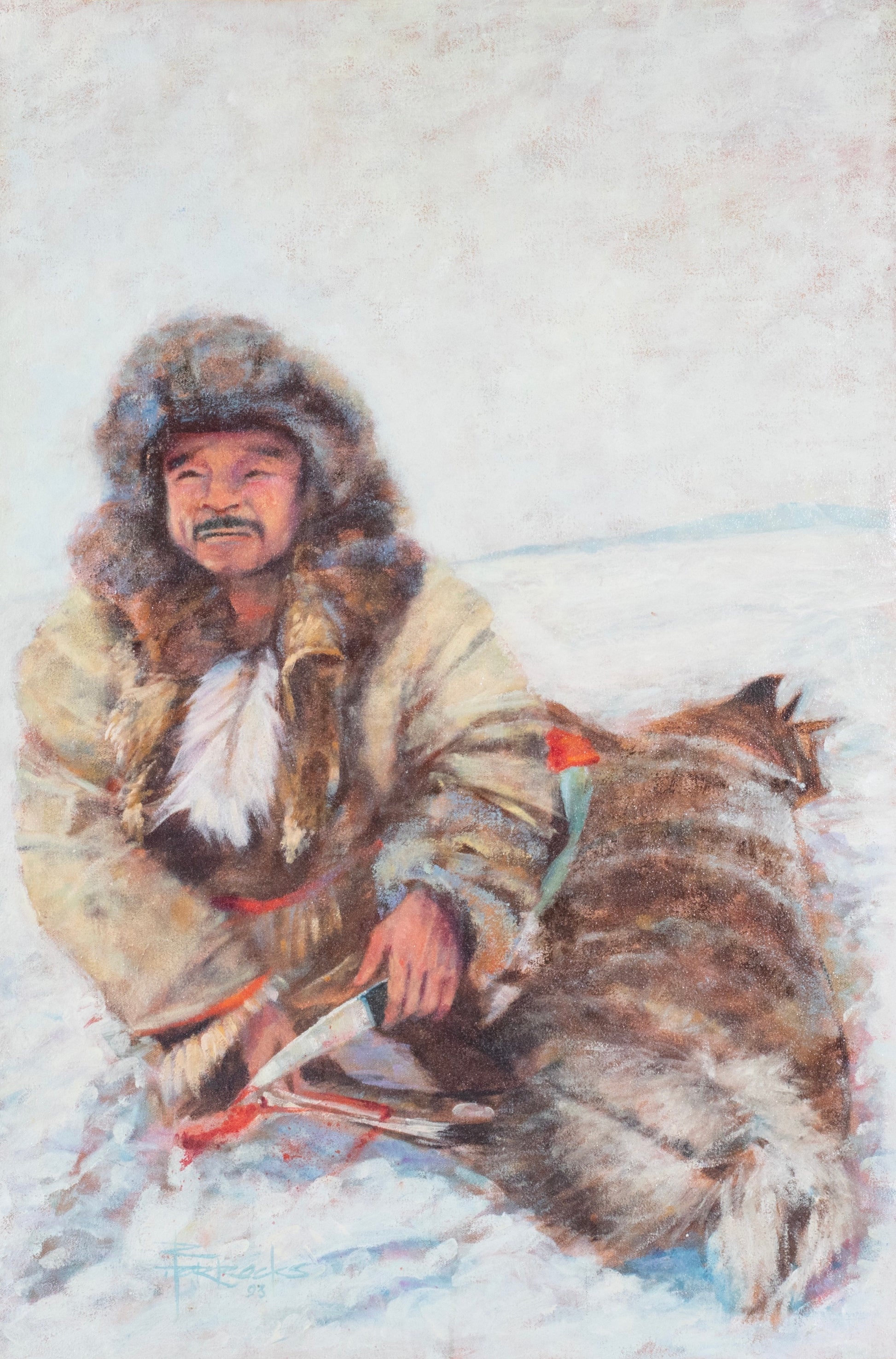 A man in heavy furs and skins kneels beside a dead animal, pausing for a moment to gaze into the distance. Hovering a knife over the animal’s leg, we observe a moment of reflection and appreciation for a life taken. The vast, barren landscape surrounds him, emphasizing his isolation. Using muted colors and soft brushstrokes to convey a sense of stillness and introspection, Horrocks invites the viewer to share in the man's contemplation.