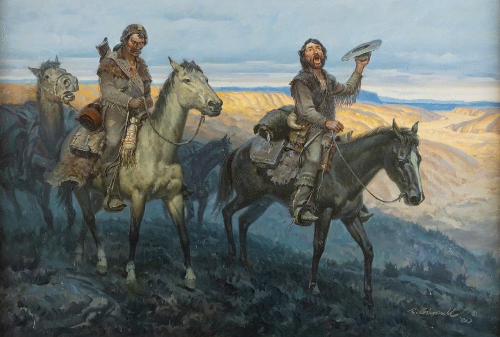 Two mountain men, dressed in fringe leather and mounted on horses, lead a herd of pack animals across hills overlooking a vast valley. One man has removed his hat and is enthusiastically speaking while the other disgruntledly listens. Dusky shadows begin to envelop them, highlighting the face of the orator and the warm hues of the valley below. The vast cloudy sky adds a sense of grandeur to the scene.