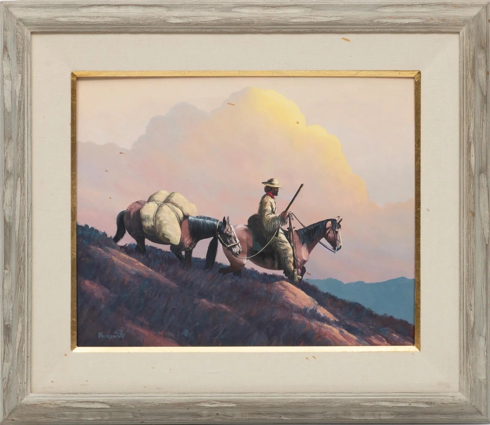 A man guides his horses down a steep, rocky hill. He is dressed in a fringed, lightly colored western ensemble. Large pink clouds rise in the distance, gracefully haloing the man. The clouds catch the fading sunlight, creating a beautiful pastel backdrop that perfectly juxtaposes the rugged scene in the foreground.