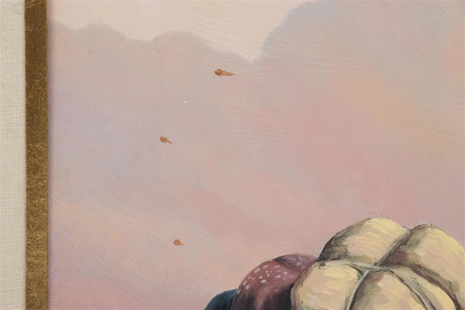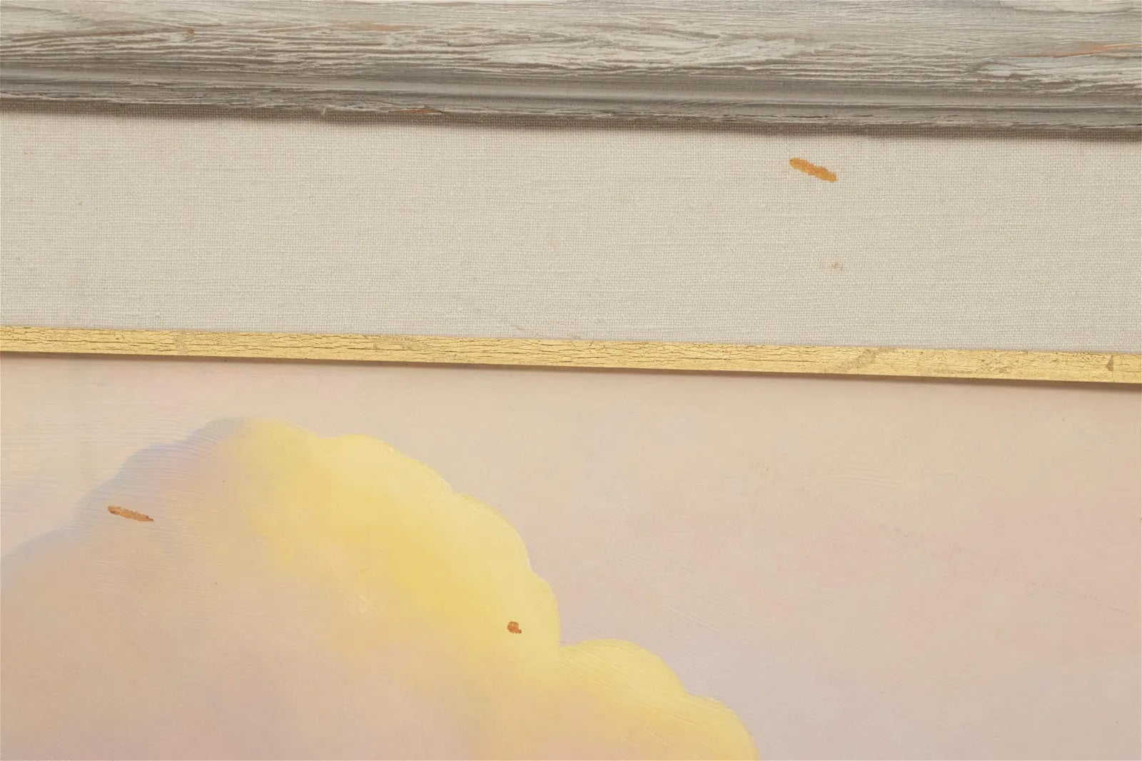 Scattered drops of surface residue on the painting, matting and frame (could be removed with a cleaning). Light surface scuff in the upper right corner. Chip to the frame at the back of the upper left corner.