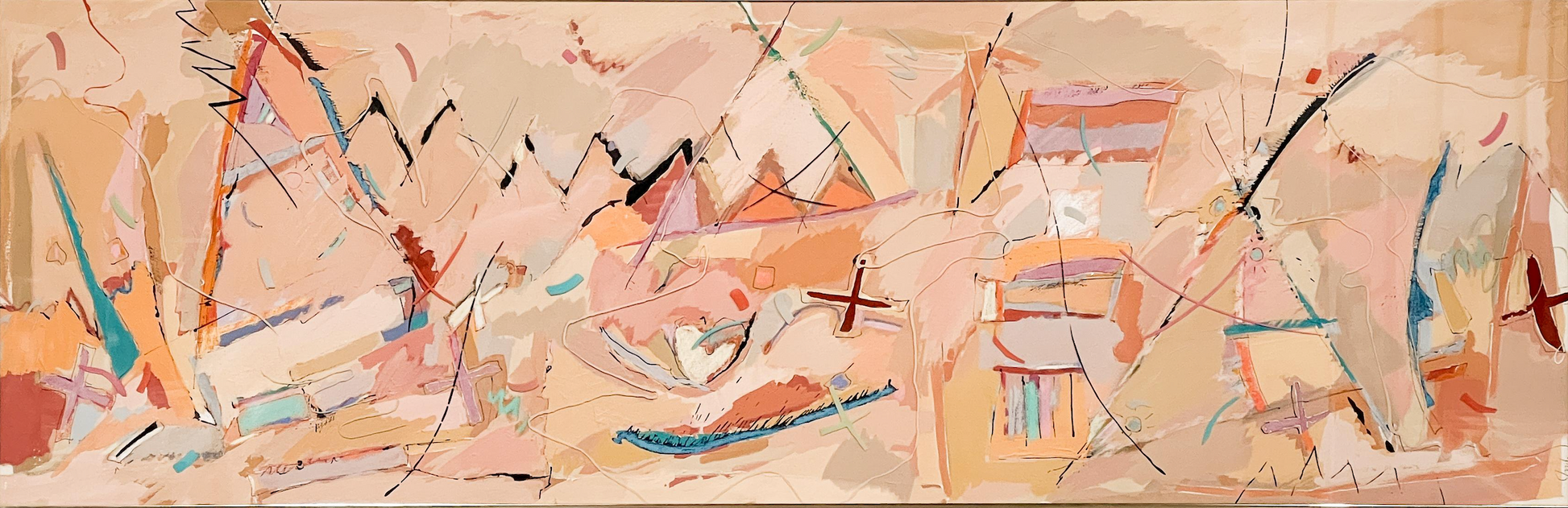 Abstract Native American symbols and tents appear against a background of pale tans and pinks. Boldly colored details and elements that have been painted directly on the inside of the glass create a distinct multidimensional effect. The long, horizontal canvas might distinguish the scene as a landscape, despite the generally ambiguous content.