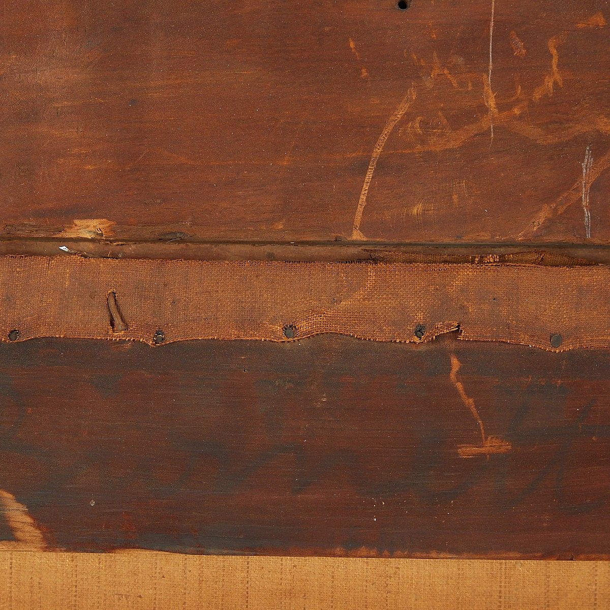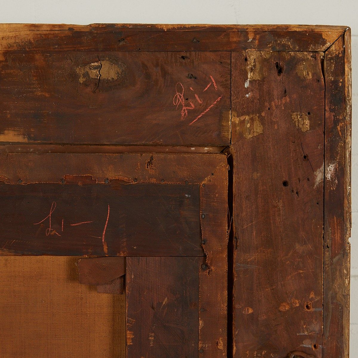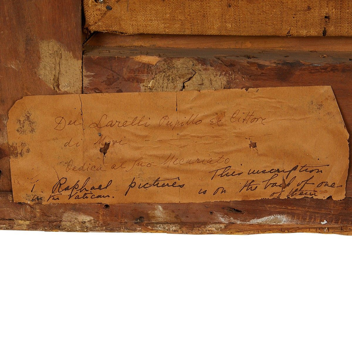 Done after the great master Raphael, the original fresco of this work is located in the Apostolic Palace in Vatican City, where it can be found in a series of rooms known as the Stanze di Raffaello. This particular work is in the Stanza di Eliodoro, and depicts the encounter of Leo the Great with Attila. Legend says that Saints Peter and Paul miraculously appeared during the meeting of the two figures, causing Atilla to cease an invasion on Italy. The colosseum, an aqueduct, and an obelisk are seen in the distance, marking the setting of this work at the gates of Rome.