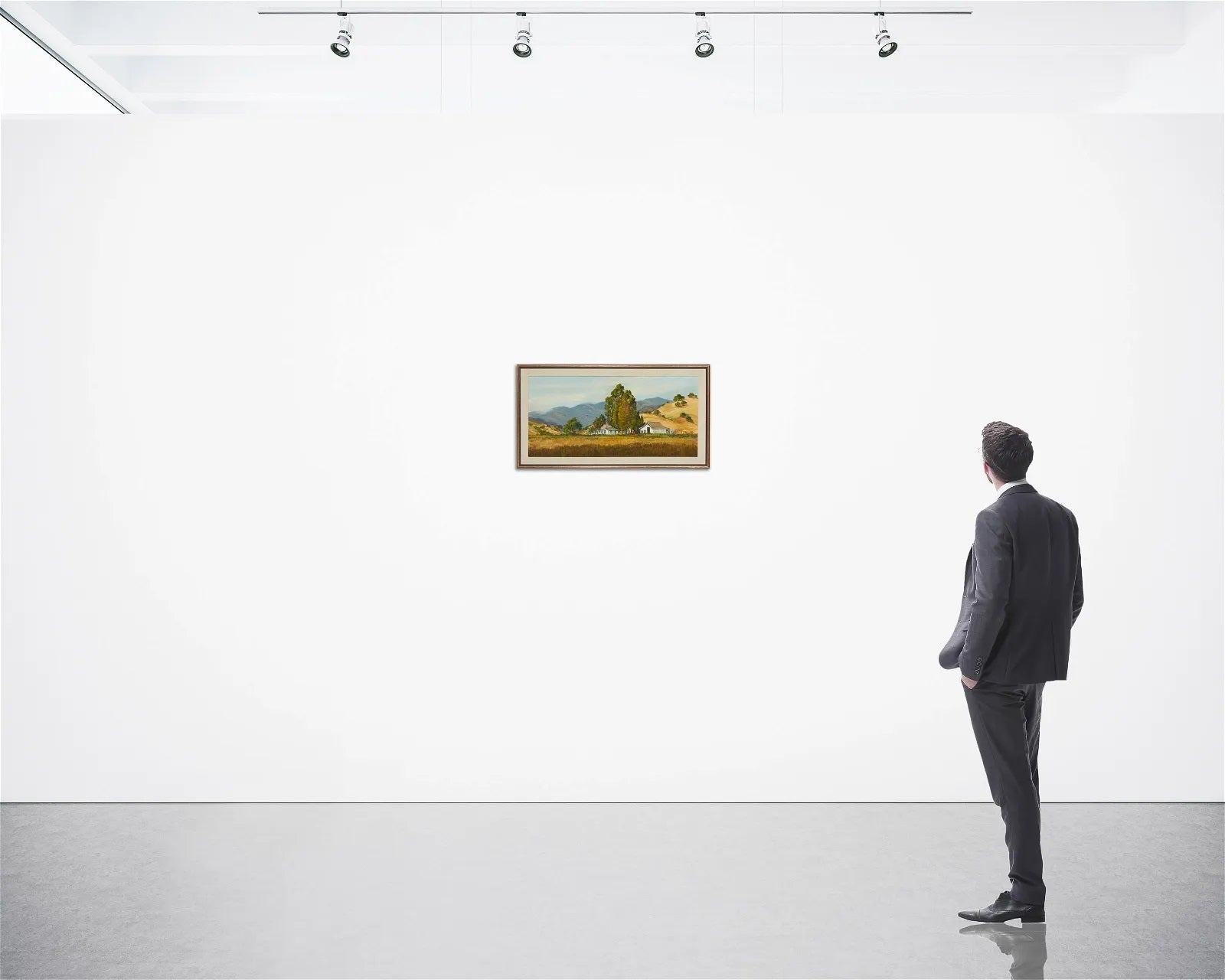 Set against blue-grey mountains and slightly overcast skies, a peaceful homestead is nestled among yellow rolling hills and grassy fields. The combined aspects of the white picket fence, stacked hay bales, and colorful cars bring additional energy to this scene. The rich, full trees towering above create a feeling of protection and seclusion for this homey escape.